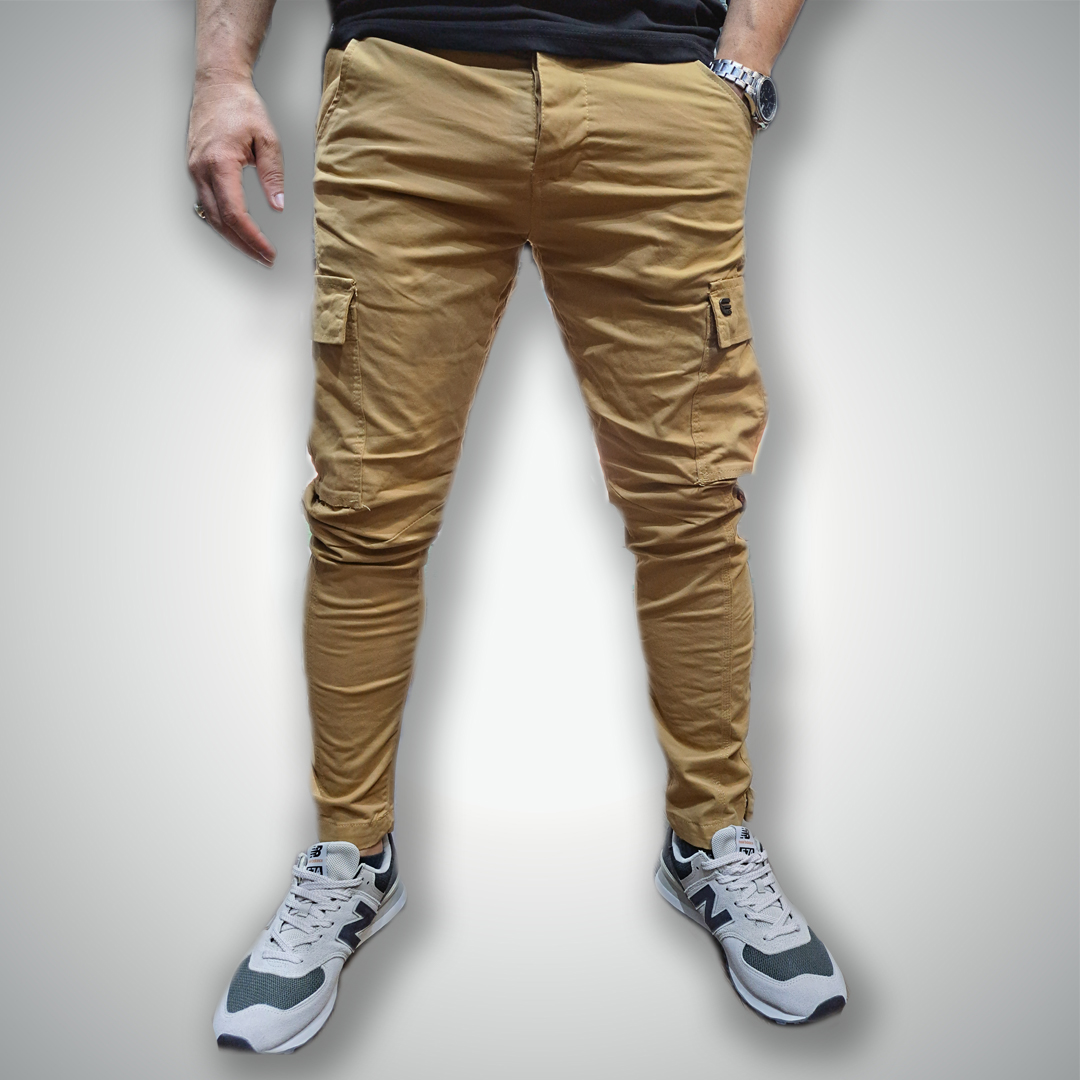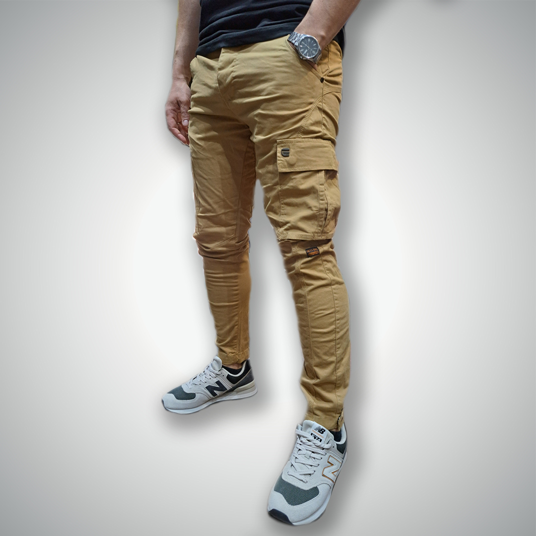 Pantalón cargo con bolsillos frontales y laterales. Cierre en bolsillo trasero. Acabado con broches par ajustar a medida.