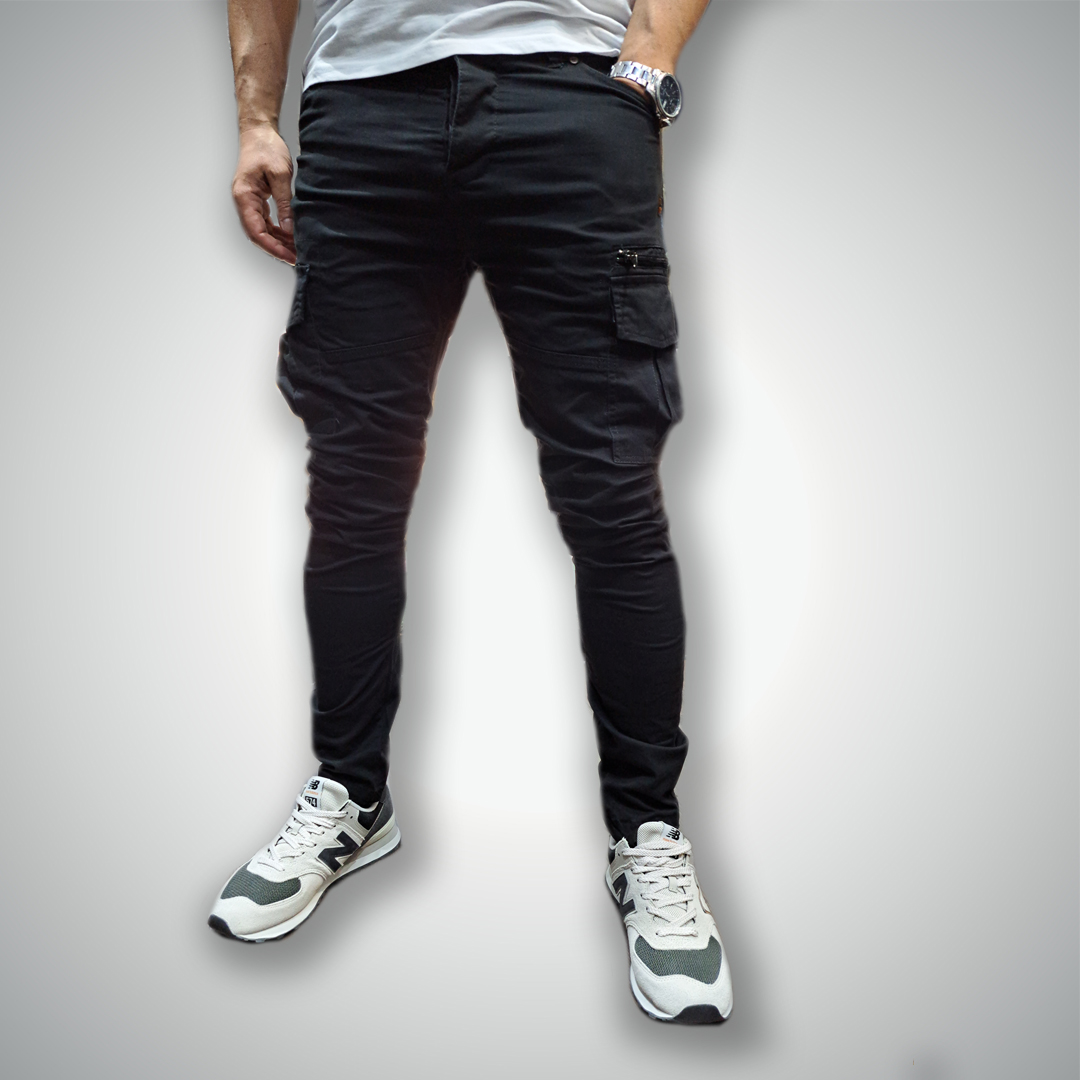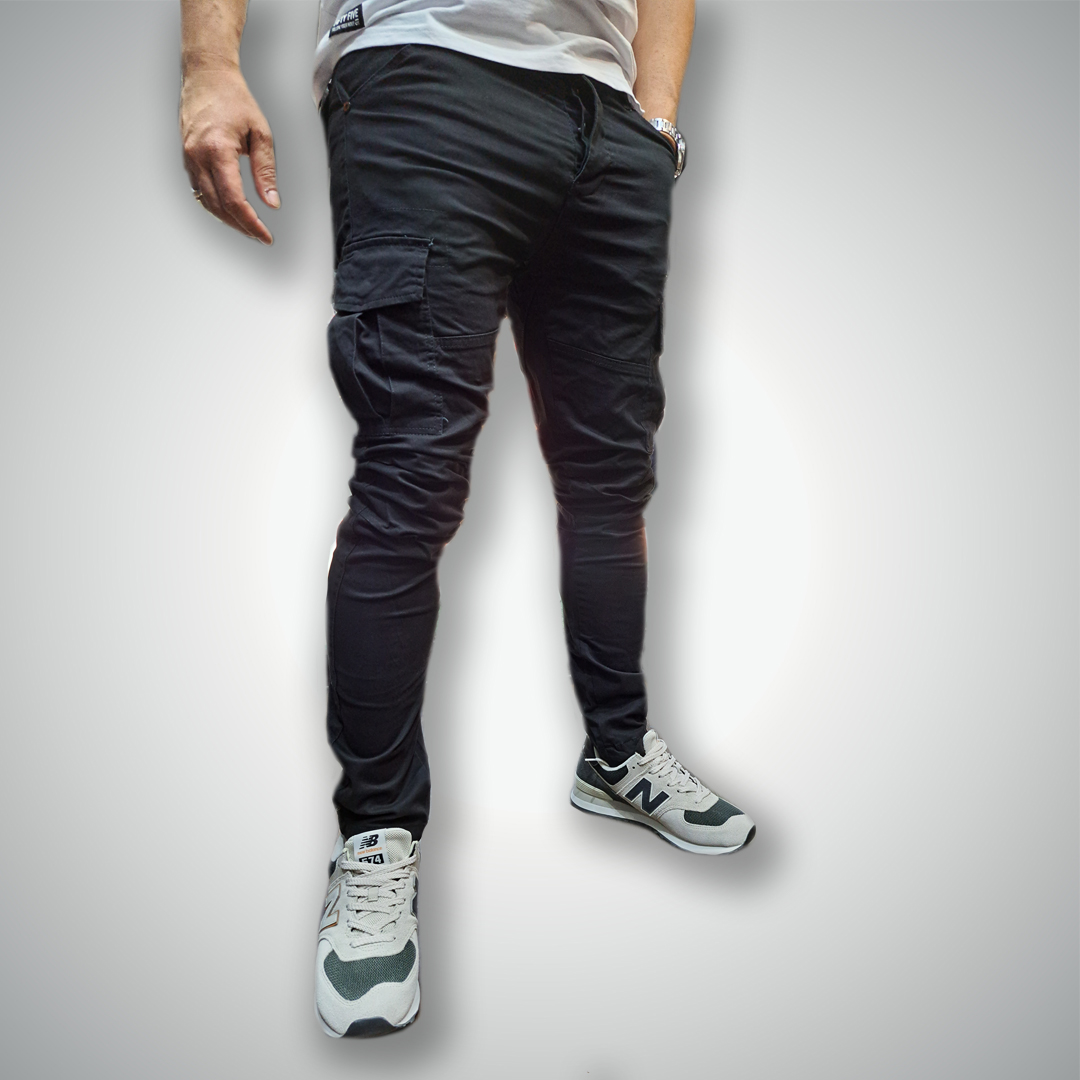 Pantalón cargo con bolsillos frontales y laterales. Bolsillo trasero con tapa. Acabado para ajustar a medida.